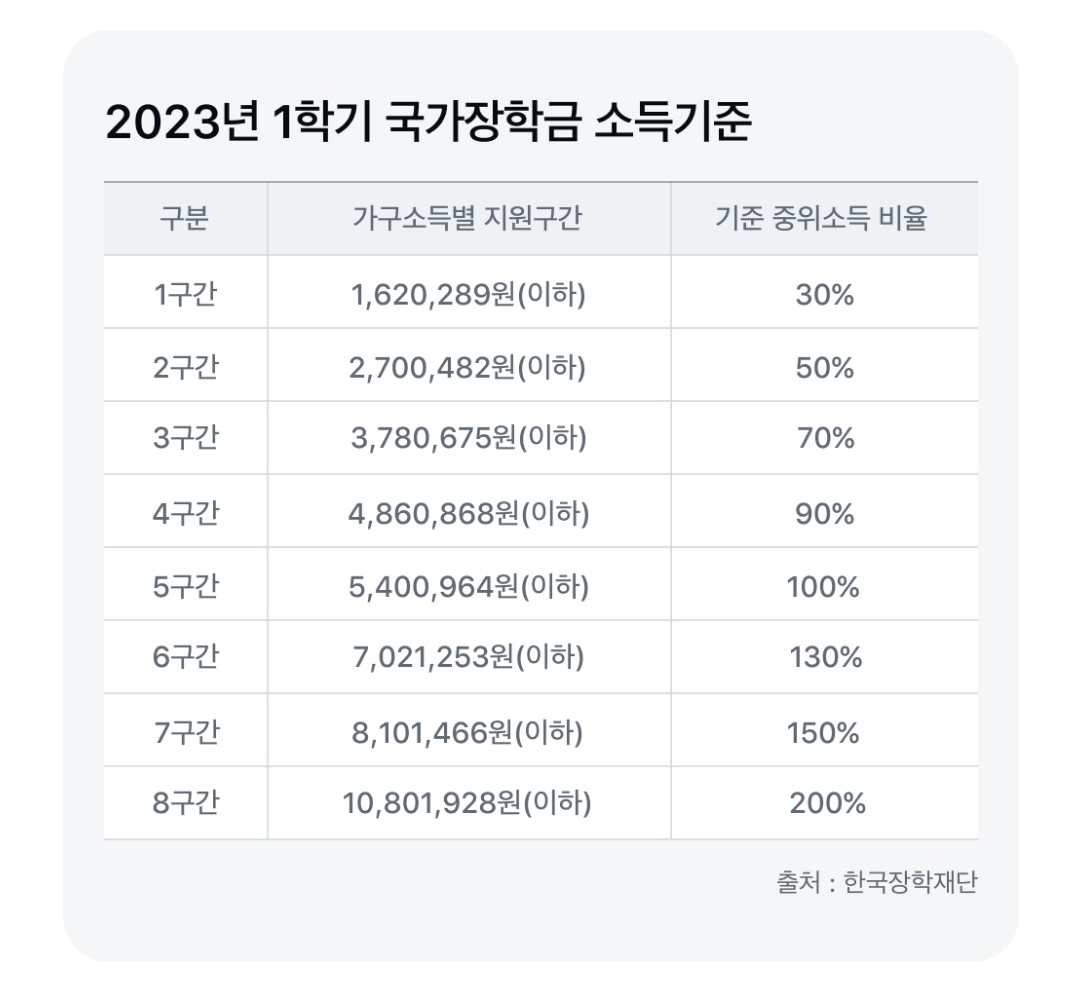 정리하자면 소득을 소득 기준표에 의해 8구간 이내이고 학점은 12학점 성적 80점, B학점 이면 누구나 신청이 가능합니다.